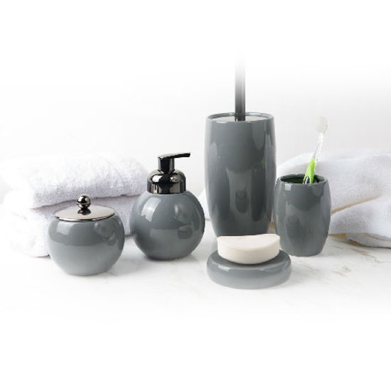 The Marand bathroom set boasts an elegant and dainty design. It includes a lotion dispenser, a soap dish, a cotton jar, a tumbler, and toilet brush holder. This set is able to adjust to your ideal color.
