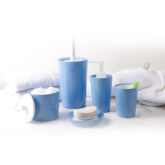 The Chasm Ⅱ bathroom set boasts a neat and simple design in allover blue. It comes with a lotion dispenser, a soap dish, a cotton jar, a tumbler, and a toilet brush holder. This set is a great addition to your elegant bathroom.