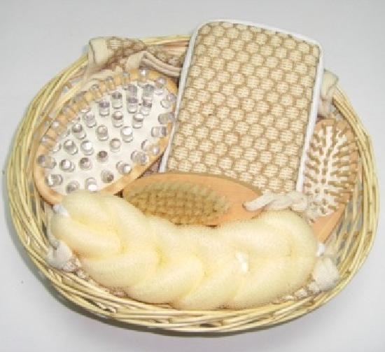 - Include a wooden massager brush, a wooden hair brush, a wooden nail brush, a 45g PE mesh back strap, a bath sponge and a willow basket.