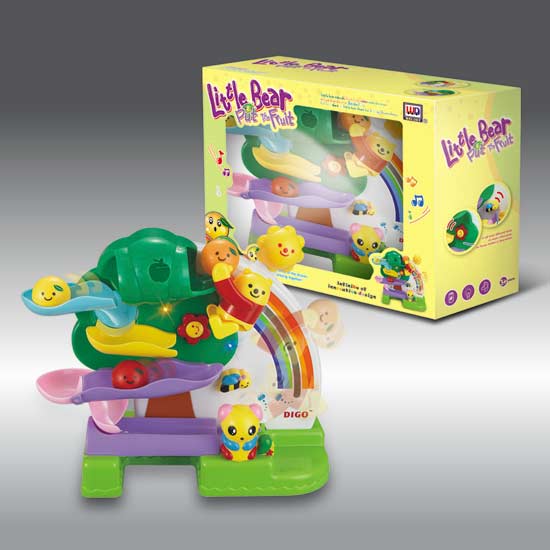 Displayed here is a battery-operated bear playset with a cute and adorable look. The colorful construction of this bear playset is appealing to young children. This battery-operated bear playset is ideal for little kids.