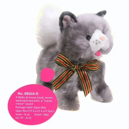 The battery-operated plush cat has a cute and adorable face. The brilliant striped bow stands out beautifully against its fluffy gray fur. This adorable and elegant plush cat will make a lasting impression as a gift or display.
