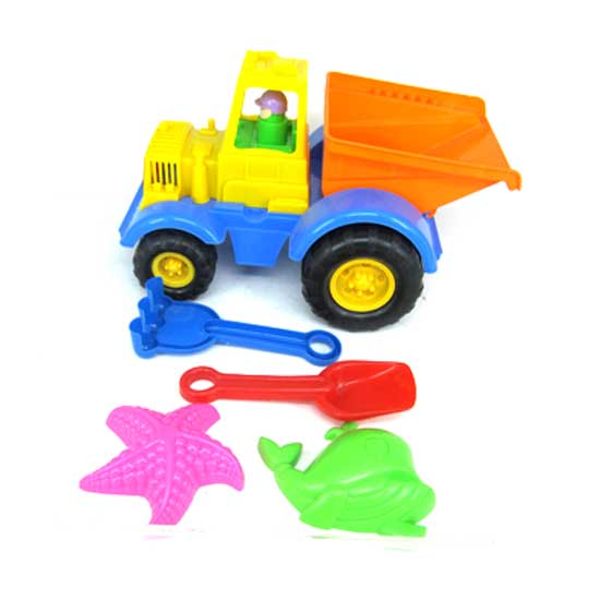 Displayed is an adorable beach car carrying assorted sand toys and tools. The vivid finish easily captures kids' attention. The durable construction ensures timeless play.