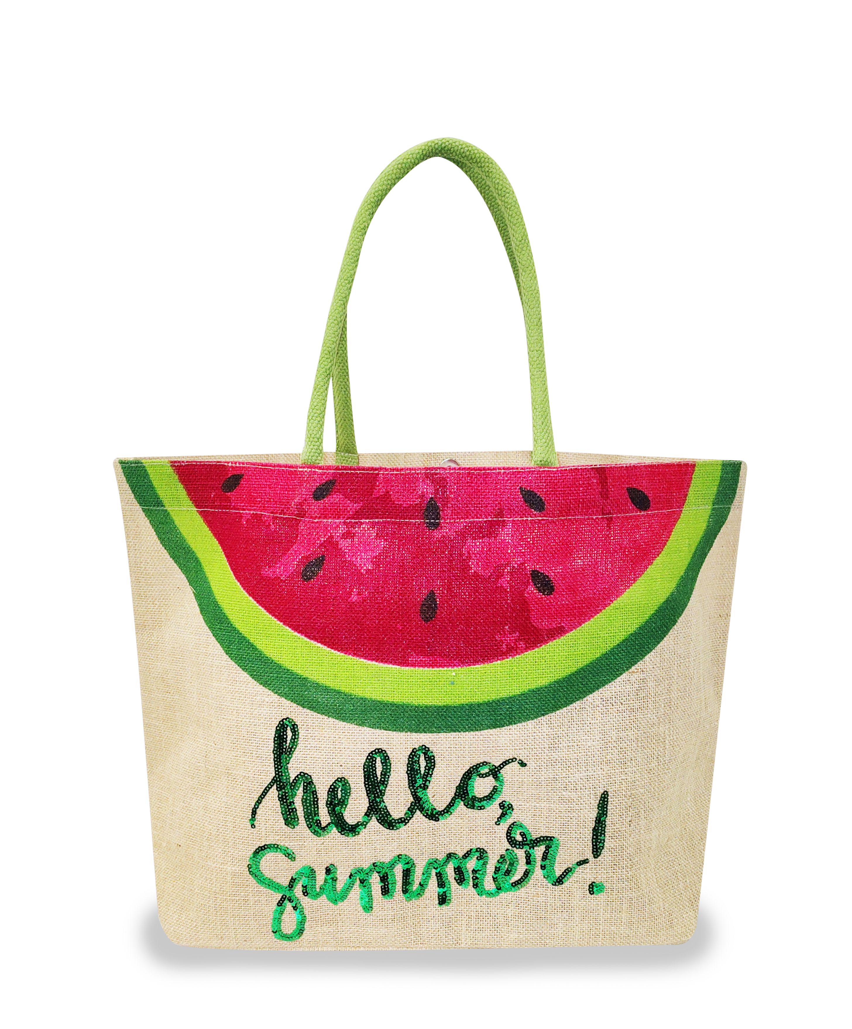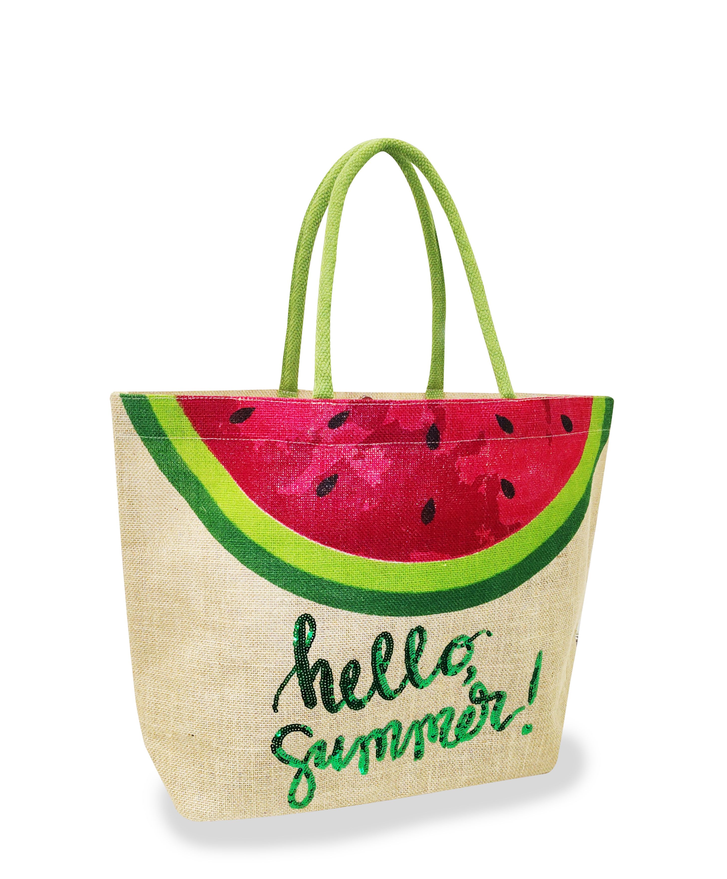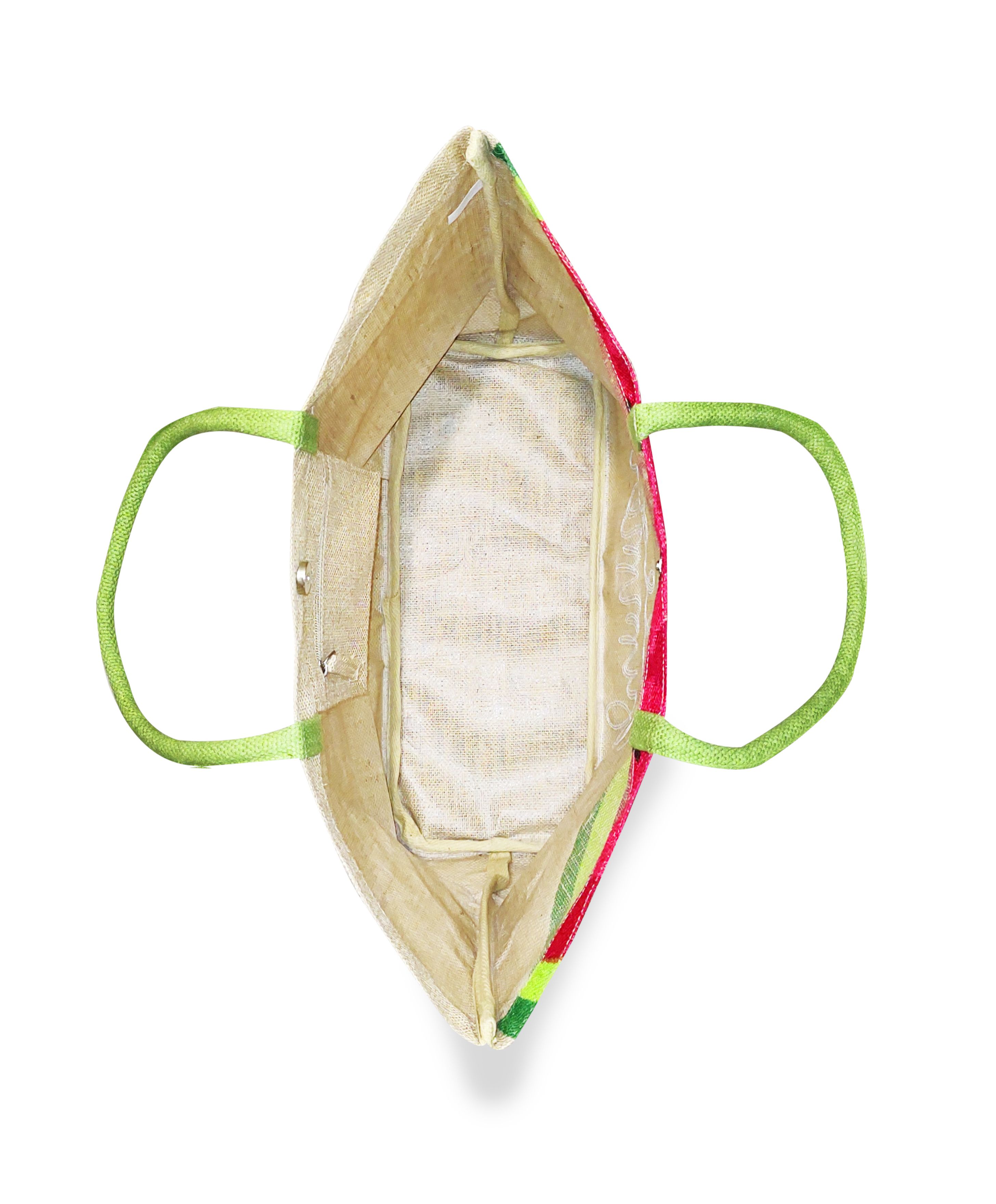 LAMINATED JUTE BAG WITH PADDED WEBBING HANDLES & SEQUINS DESIGN & PRINT AT FRONT & MAGNET CLOSURE WITH INSIDE ZIPPER POCKET.
