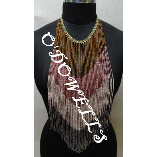This fashionable necklace features a unique cascade design. It is made up of numerous strands of small beads of four colors. The attractive necklace is sure to make you the focal point in any party or ball.
