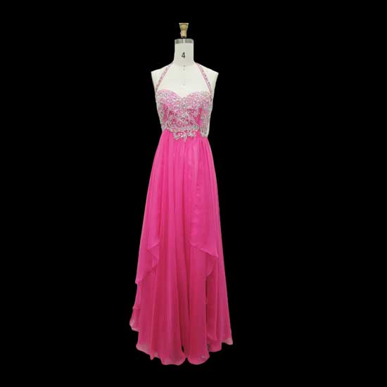 This prom dress in pink features a helter neck and sweetheart front with twinkling beading. It comes with a layered skirt to give subtle details. You will be the center of attention with this breath-taking gown made of chiffon.