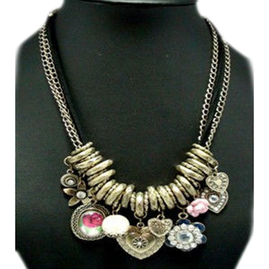 This chunky necklace is made with different fancy beads chained together. The beads are designed in various appealing shapes like hearts or flowers. This fashionable necklace makes a nice piece of accessory for casual outfits.