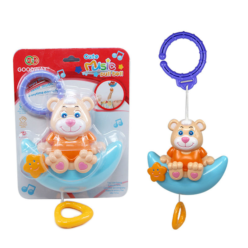 This cute musical pull bell comes in the design of a cartoonish bear sitting on a crescent. It has a loop on top for attaching to strollers or car seats and has a handle for babies to pull down to play music. The colorful design of this pull bell can attract the attention of babies and the music is great for stimulating the hearing of babies.