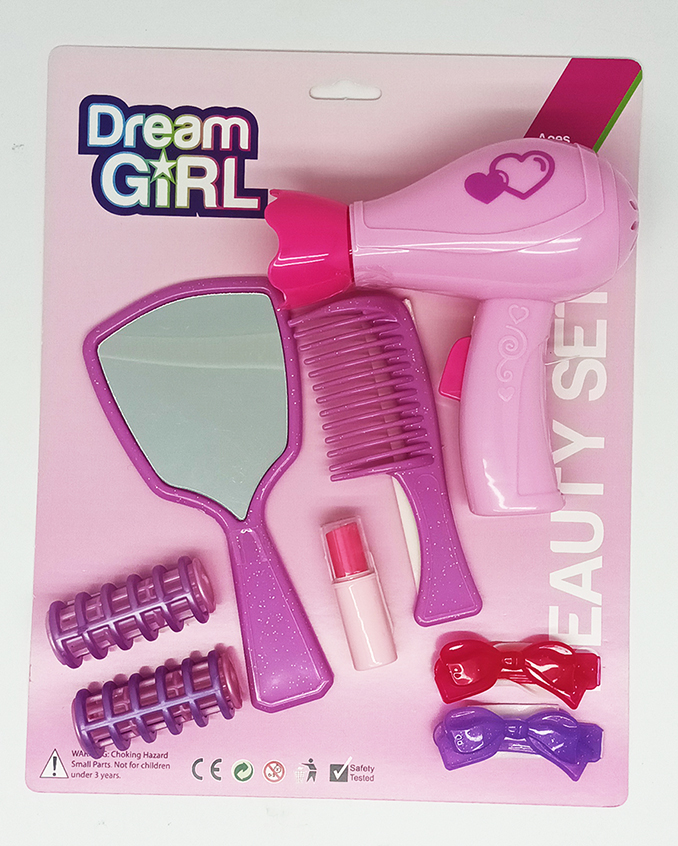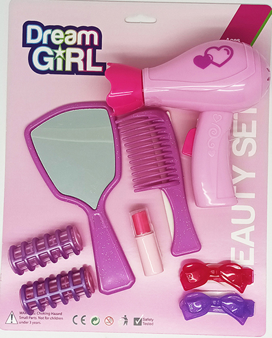 Girl toys beauty set : hair dry, comb + Mirror , hair roll, hair clip on blister card