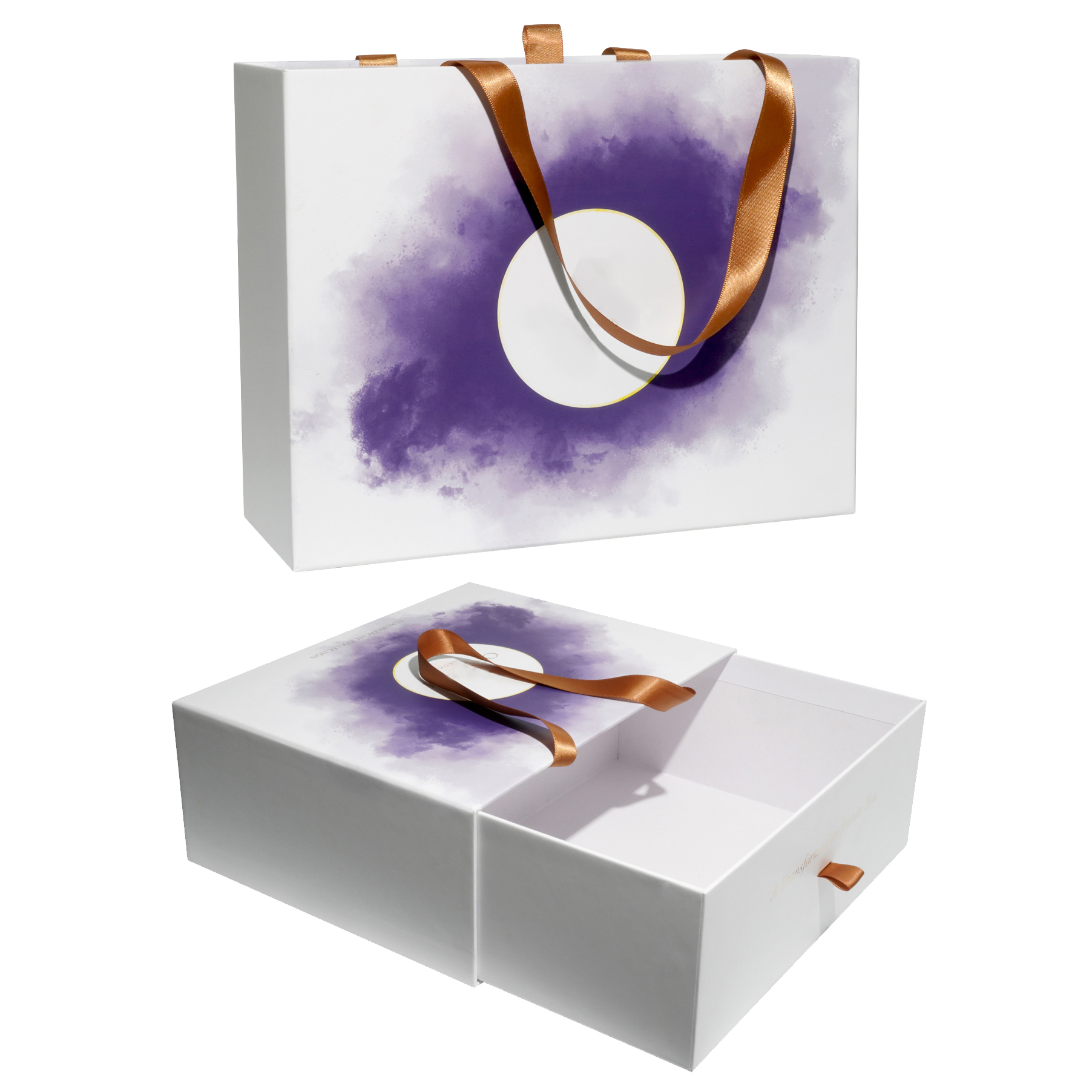 This cosmetic premium rigid box features a sturdy structure and an elegant premium ribbon handle rope. It is functional, attractive, and luxurious, making it perfect for high-end beauty and cosmetic gift packaging.