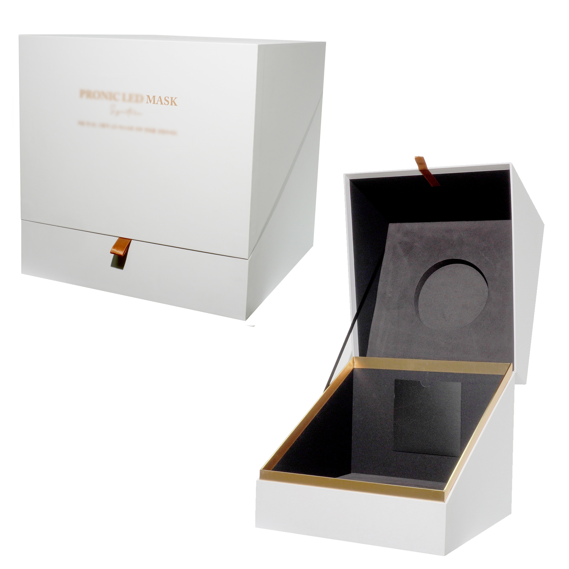 This premium mask rigid box combines bias opening, luxury gold/silver hot-stamping, and elegant ribbons. It is protective, upscale, and experiential, ideal for high-end beauty mask packaging.