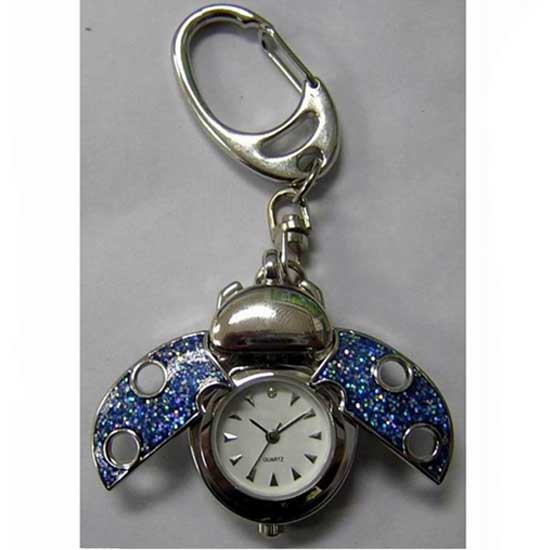 Showcased here is a keychain watch in a fashionable style. The watch is designed in a lovely beetle shape plated in shiny silvery finish. Swing open the glittering blue wings and see the nice dial.