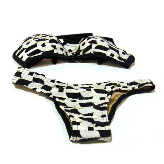 This is a set of ladies' bikini swimming wear which is made of black and white coloured patterned fabric. The bikini set is made of 100% polyester.