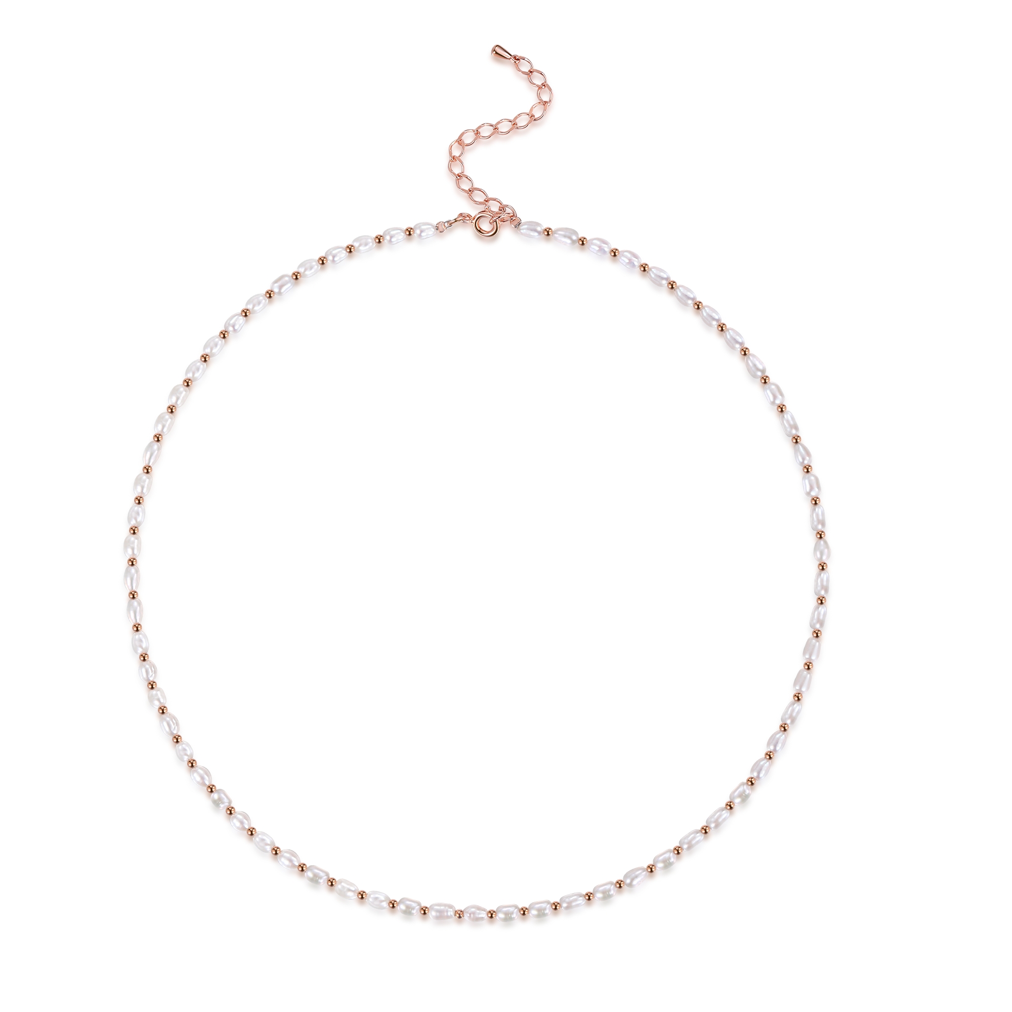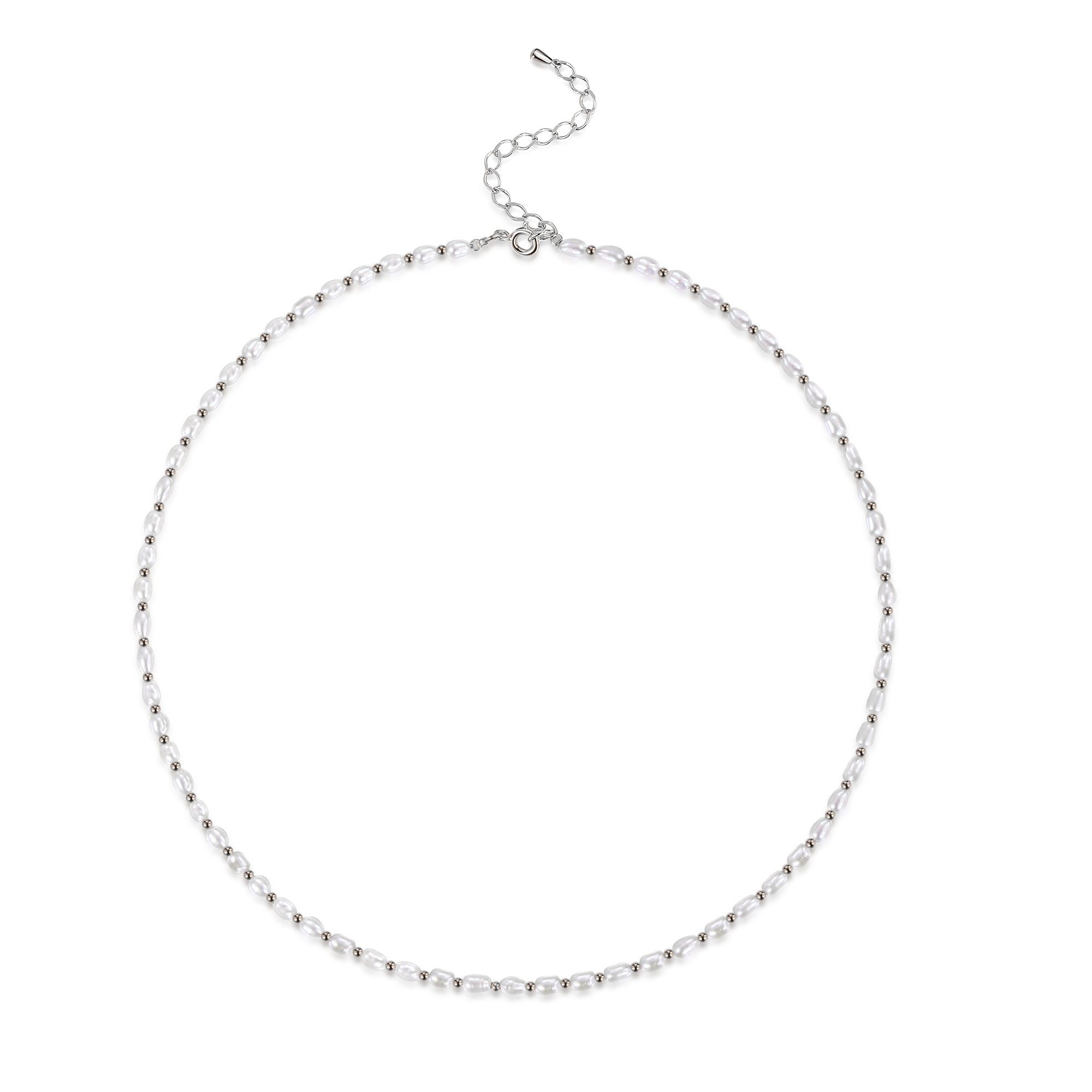 Sterling Silver Necklace with 3-3.5 mm Oval Shape Freshwater Pearl & Silver Beads