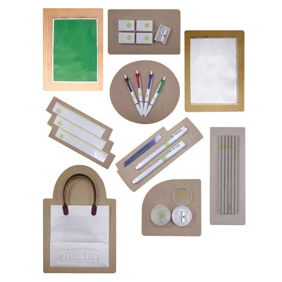 These stationery are made of biodegradable material. Stationery include paper, ball pen, pencil, pencil sharpener, ruler and bag. Although they do not have fancy painting, their natural and simple style can still attract people.