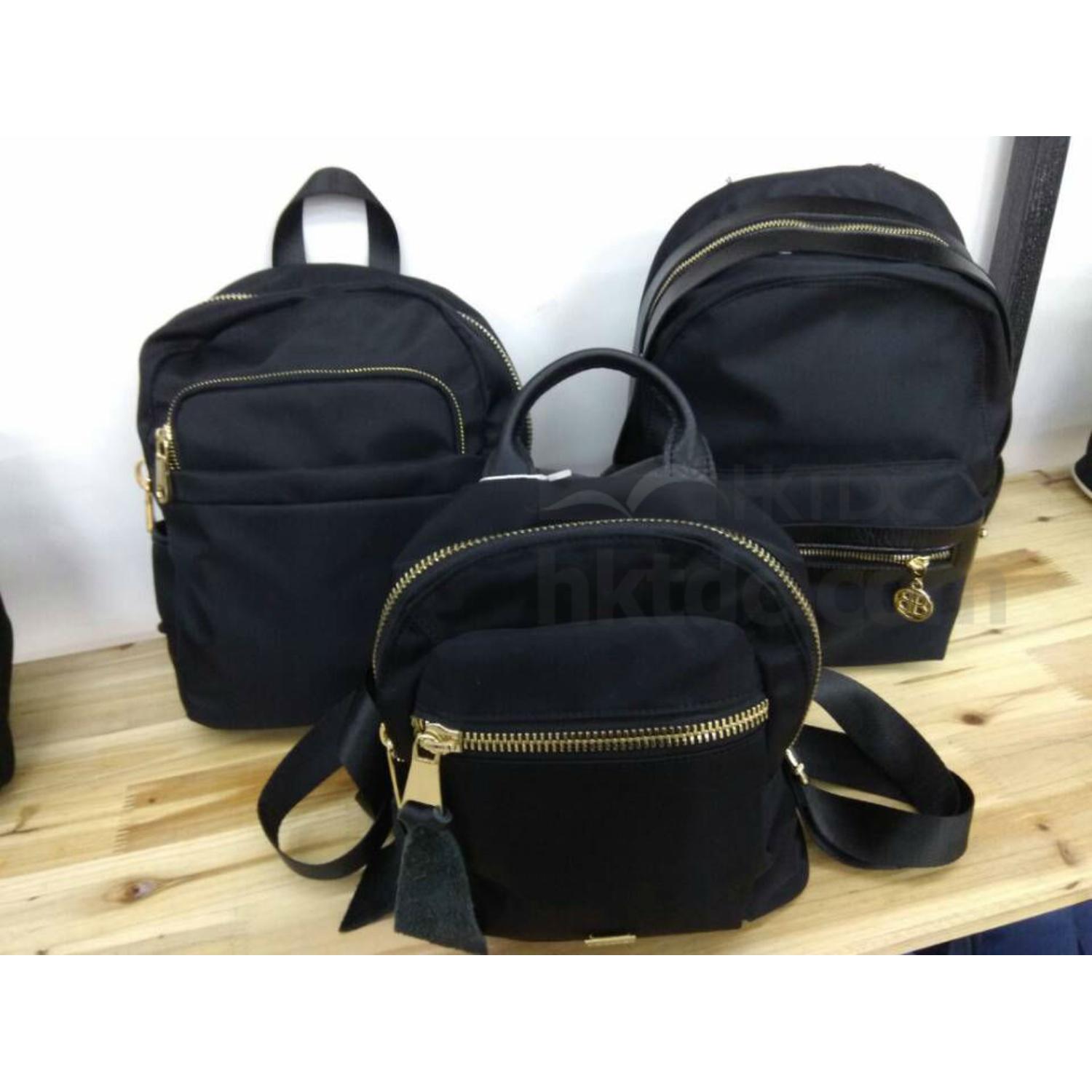These are bags which include a backpack or knapsack, a handbag and a briefcase. The briefcase has both shoulder strap and hand holder for holding documents or a laptop.