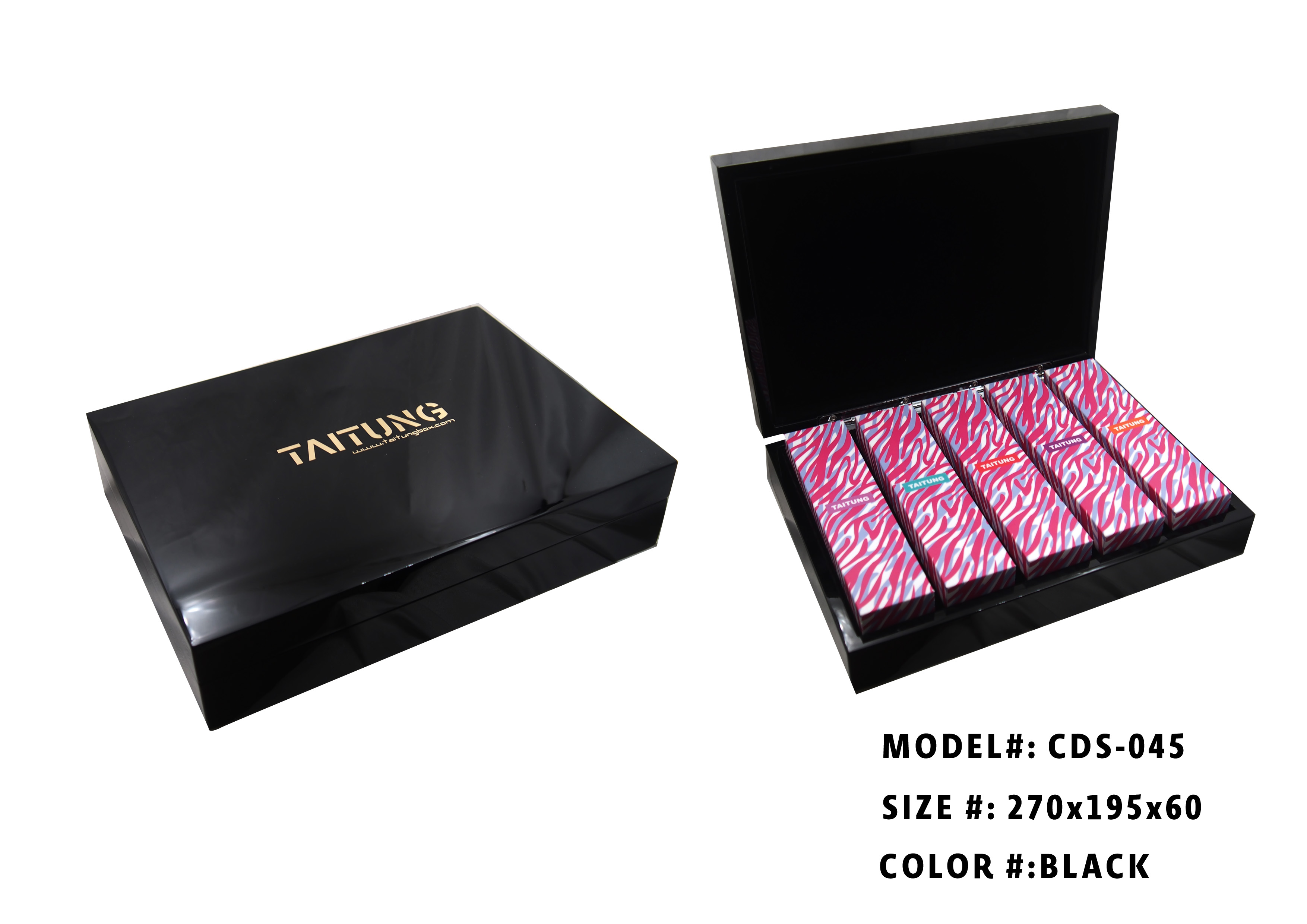 The wooden box has a varnish effect. Different sizes and inner can be customized