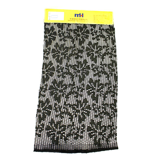 This is a blended fabric featuring a white background with a black lace cover. It is made of high-quality materials with excellent craftsmanship. There are different designs available for you to choose from.