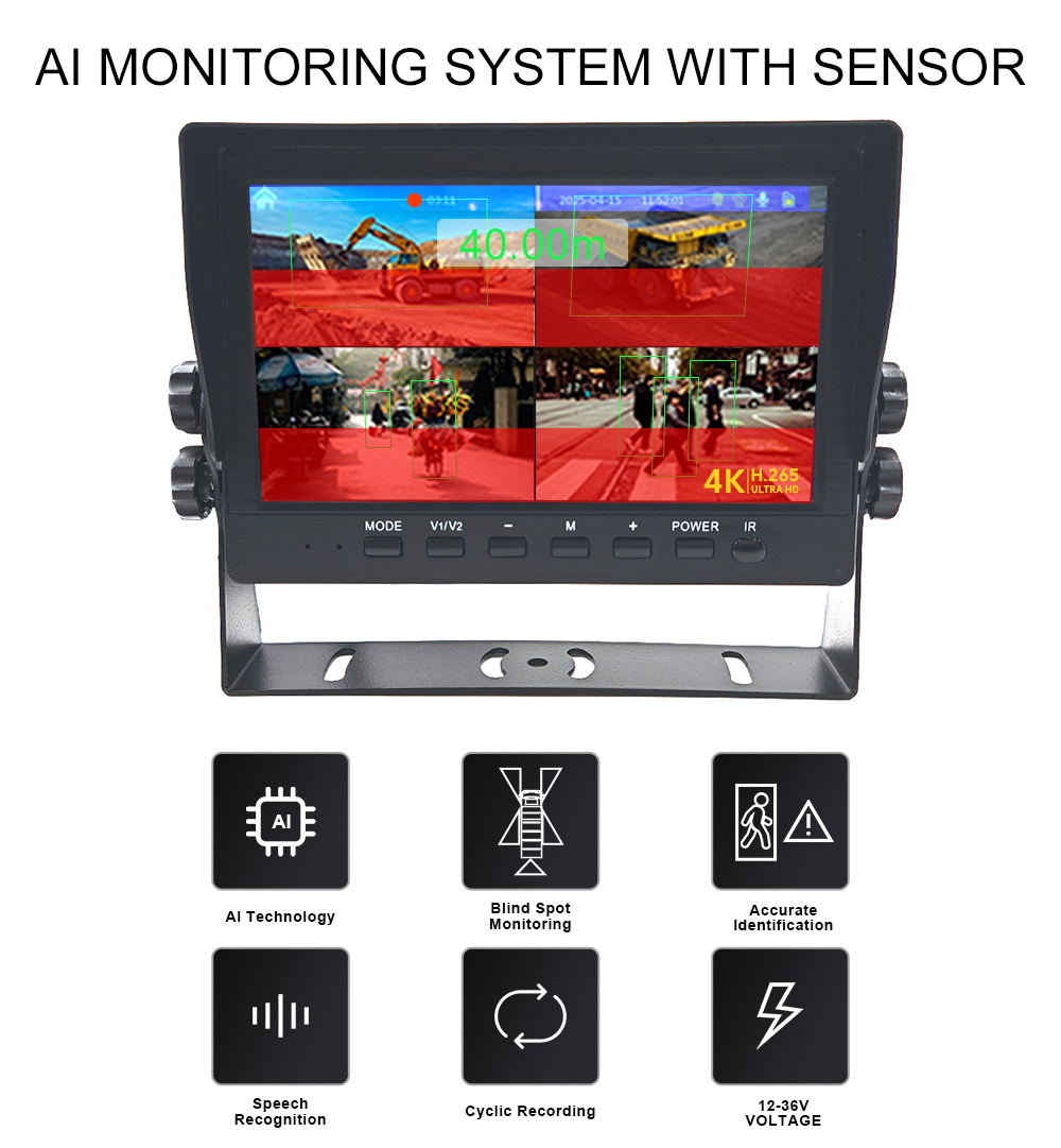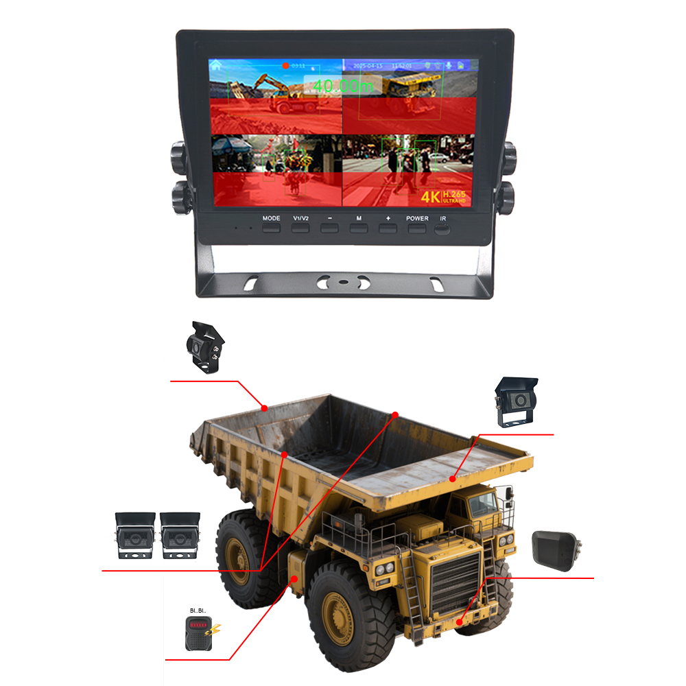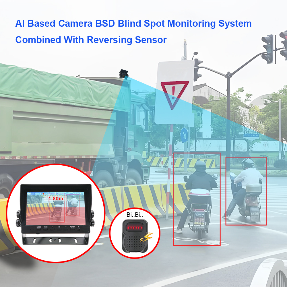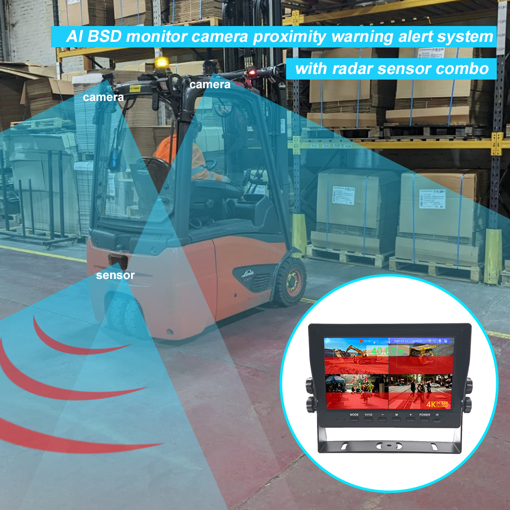 This product is a visual BSD Radar AI monitoring system equipped with a high-performance 4pcs AHD 1080P cameras and 1pc 10.1 inches AI monitor, 1pc 40m radar and 1pc external buzzer. The system will show HD image on the monitor and give an alarm when there are objects or pedestrians around, so that the driver can observe and pay attention to the safety issue.