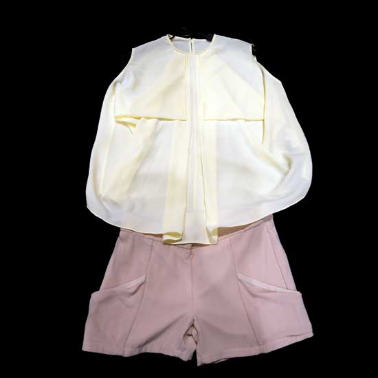 This is a blouse and a pair of short pants that are made with chiffon and crepe construction. Coming with irregular hemline, the short-sleeved blouse features a round neckline and a zippered closure at the back. The short pants are fully lined in pink to match the white blouse perfectly.