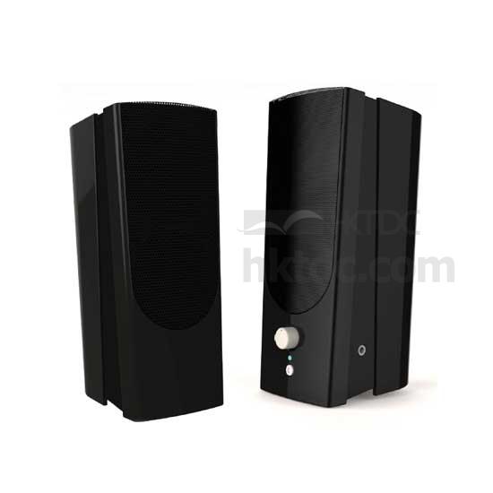 Displayed is a Bluetooth desktop stereo speaker that offers a great sound. With a wireless design, this speaker requires no wired connection and can still play your favorite music. This convenient desktop speaker is compatible with smartphones and tablets with Bluetooth capacity.