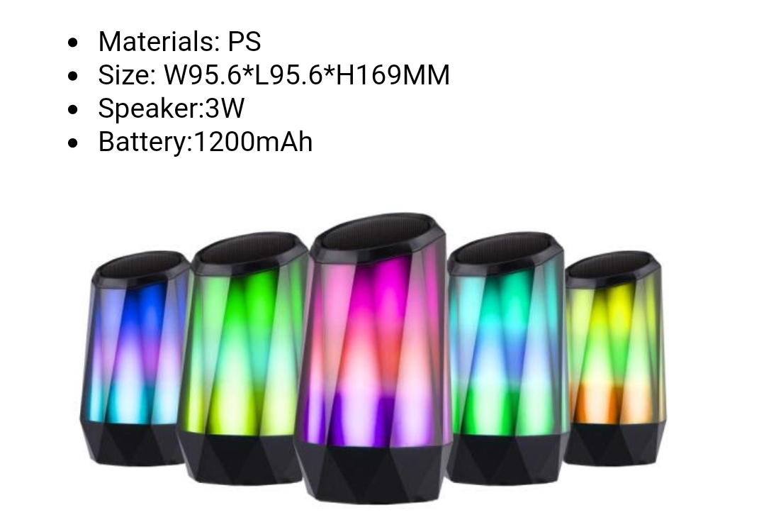 The displayed Bluetooth speaker comes in a faceted crystal design and has a multi-colored exterior. It is equipped with a 1200mAh battery to ensure a long play time and delivers outstanding audio quality. This Bluetooth speaker has a durable PS construction comes in a compact size for convenient carrying.