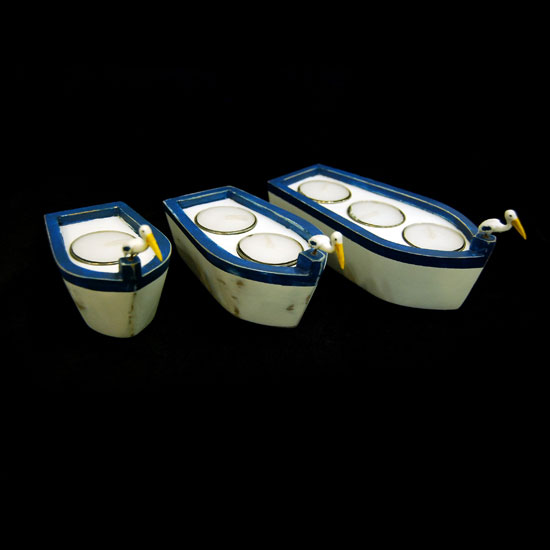 Shown here is a series of handmade boat-shaped candle holders. A cute pelican watching out for fish decorates the simplistic boat. Designs in various sizes are available for you to choose from.
