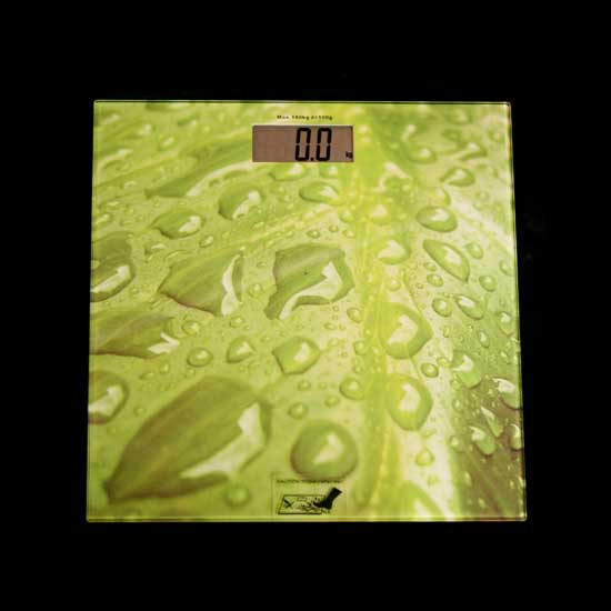 Displayed is a body scale that comes in a fresh design with dews patterns on the surface. Professionally manufactured, this body scale has a large weighing range and is durable. This body scale has a digital screen at the top for easy reading.