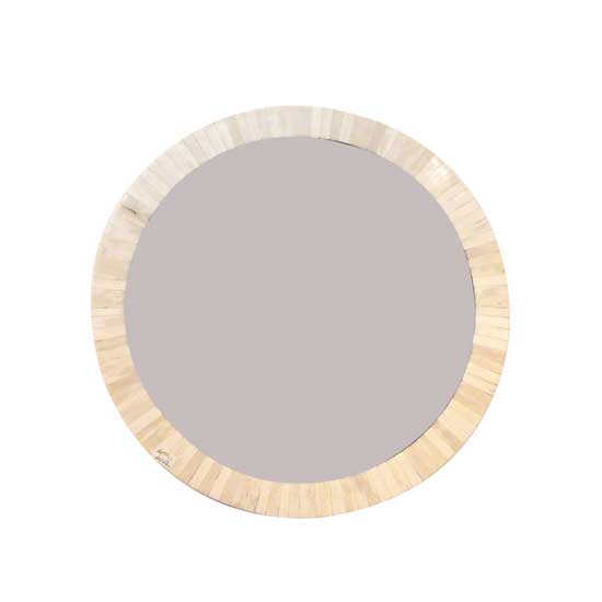 This round mirror features a white frame made of bones. The well-designed mirror goes well with different room settings. The finely manufactured piece can be used for a long time.