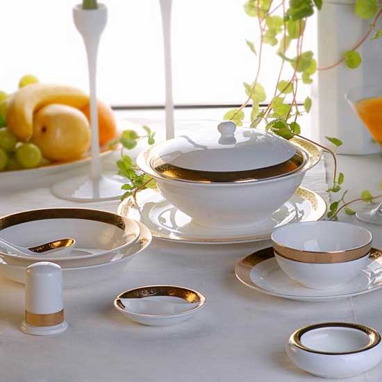 This bone tableware set comes with a luxurious content of plates, bowls and teacups. Each item in this set is decorated with a golden edge to promise a pricey image. This elegant tableware set is a great complement to decorate modern dining rooms.