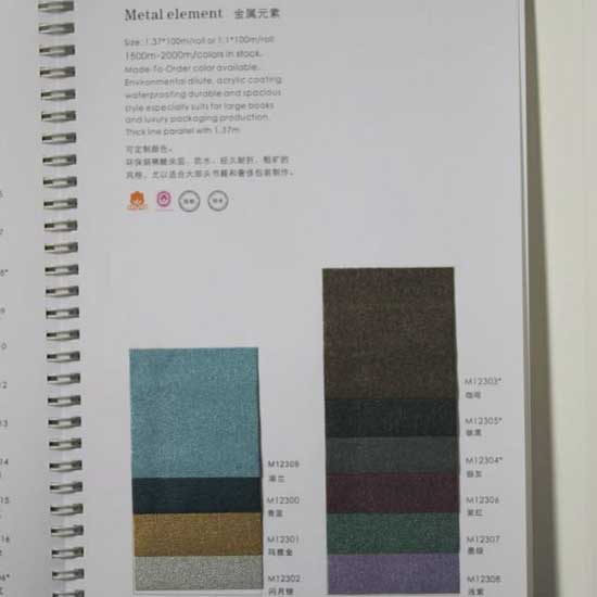 This series of book binding cloth comes in attractive metallic colors. It is made with acrylic coating for waterproof qualities and extra durability. This deluxe material especially suits large books and luxury packaging productions.