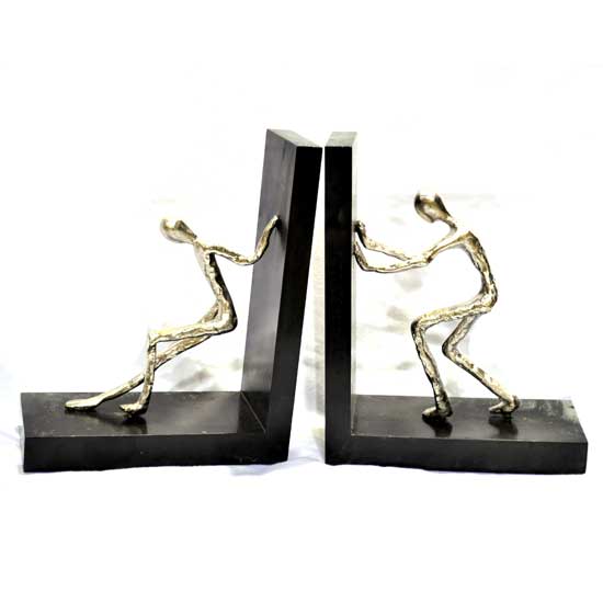 This pair of bookends comes in a humorous design. Each features a silvery man in a lively pushing pose. The bookends add an amusing touch to the bookshelf.
