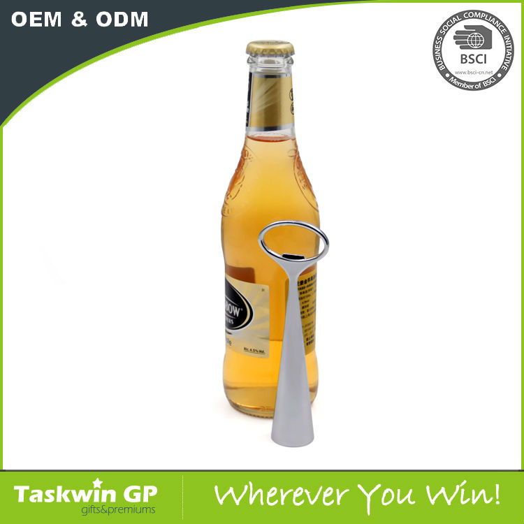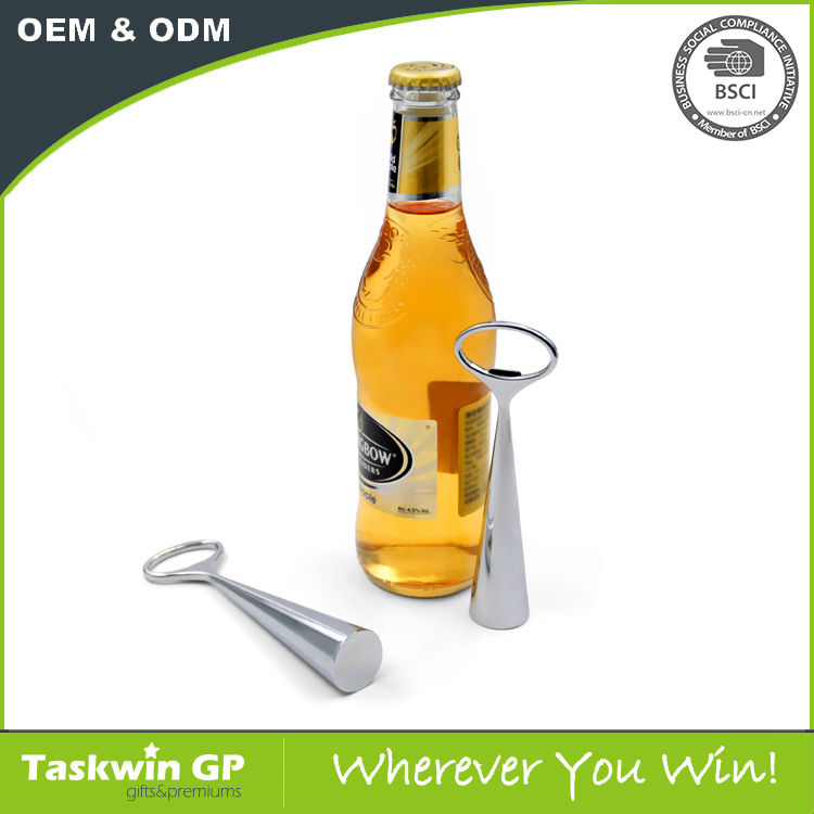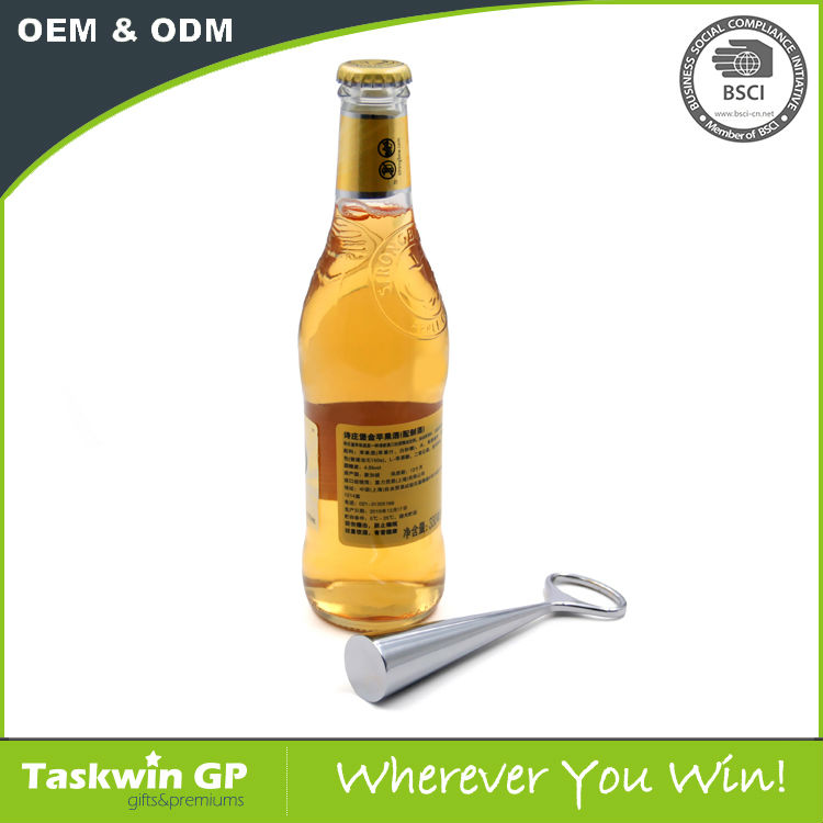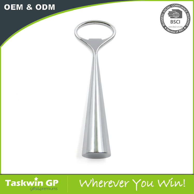 This bottle opener is made of zinc alloy and has a sleek silver toned exterior. It comes in a coned shape and is durable and easy to use. The bottle opener is excellent for opening wine and beer bottles and can be used for promotion.