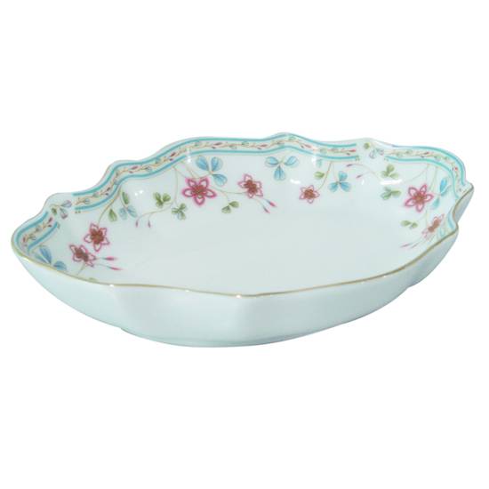 The featuring item is an elegant bowl for household use. The white shallow bowl is featured with flowers and leaves along the gold flute rim which shows a classy and refined style.