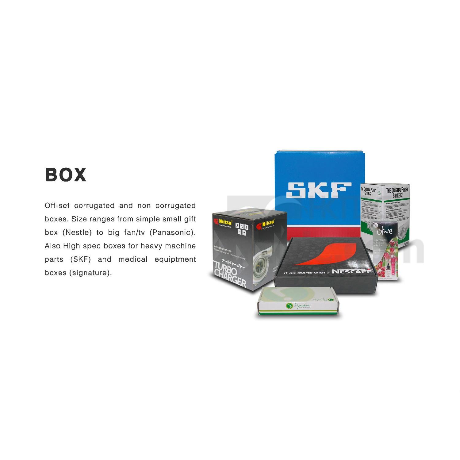 Off-set corrugated and non corrugated boxes. Size ranges from simple small gift box (Nestle) to big fan/tv (Panasonic).