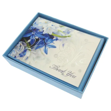 Silver foil stamped 12 cards and coloured envelops bottom box with acetate lid