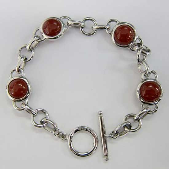 The chained bracelet boasts sterling silver construction for lasting shine. The Red Agate stones offer added glamor. This elegant bracelet makes a bold and modern addition to your jewelry collection.