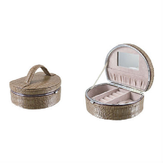 This box comes in a round shape and is adorned with leather patterns on the exterior. It has a mirror behind the lid and offers multiple compartments for storage. It is excellent for storing bracelets and other jewelry.