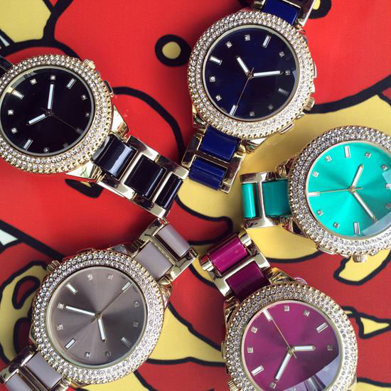 - Bright pop colored bracelet watch with plastic links and multi-row of crystals on the case.
