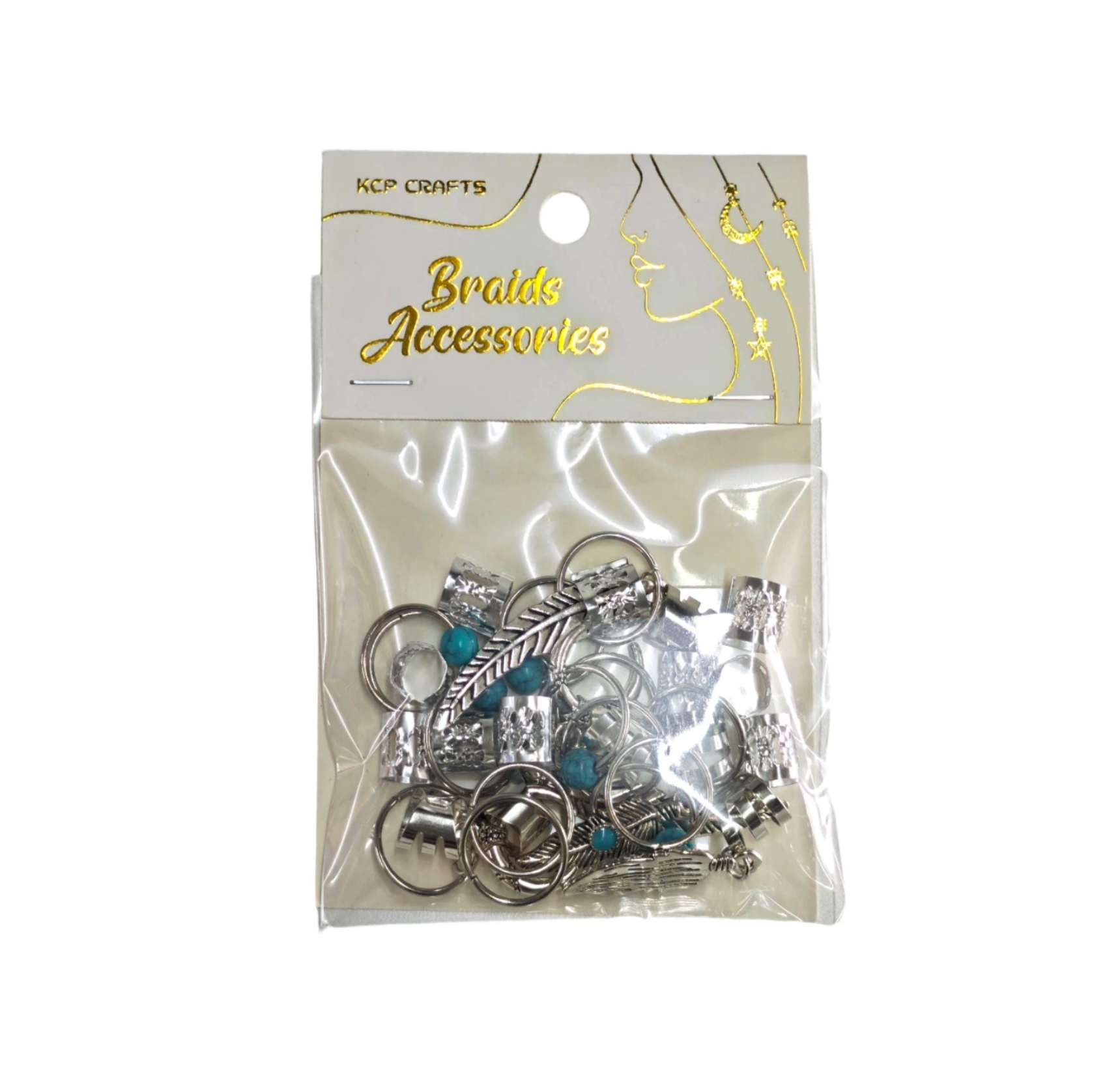 This versatile hair braid accessory set features an assortment of metallic rings, engraved tube charms, feather pendants, and turquoise beads.