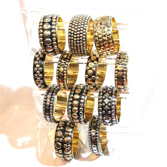 The brass bangles come in various designs. They are decorated with studded beads for a touch of uniqueness. These bracelets serve as excellent fashion accessories.