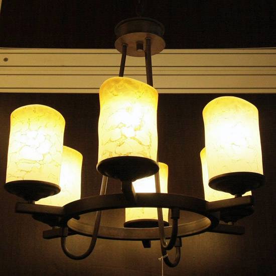 This circular-based ceiling lamp is of classical French style. The six incandescent lights are surrounded by glass-column-fashioned lampshades, emitting a warm glow of light. These light screens are removable and easy to clean.