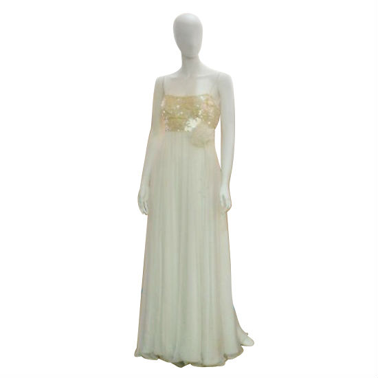 This pristine white gown is sure to draw admiration at weddings and balls with its refined design. A shimmering bodice fully covered in ivory sequins is contrasted with the flowing skirt starting at a high waistline. The translucent drapes create a sense of quiet beauty, completed with a rosette embellishment at one side at the waist.