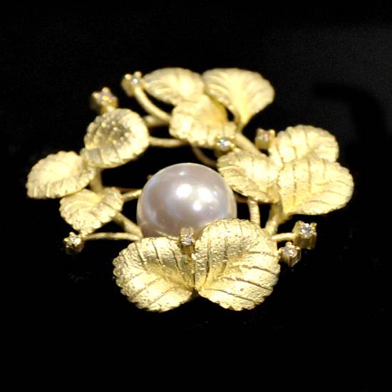 This brooch mounting provides a diamond or pearl with an ideal platform. This piece itself is a nice jewellery, as shown in the carefully designed leaves and branches. When a stone is placed among the leaves, it creates a picture of an elegant stone situated in a lake, with beautiful leaves around it. Such a romantic picture can be easily achieved by this mounting.