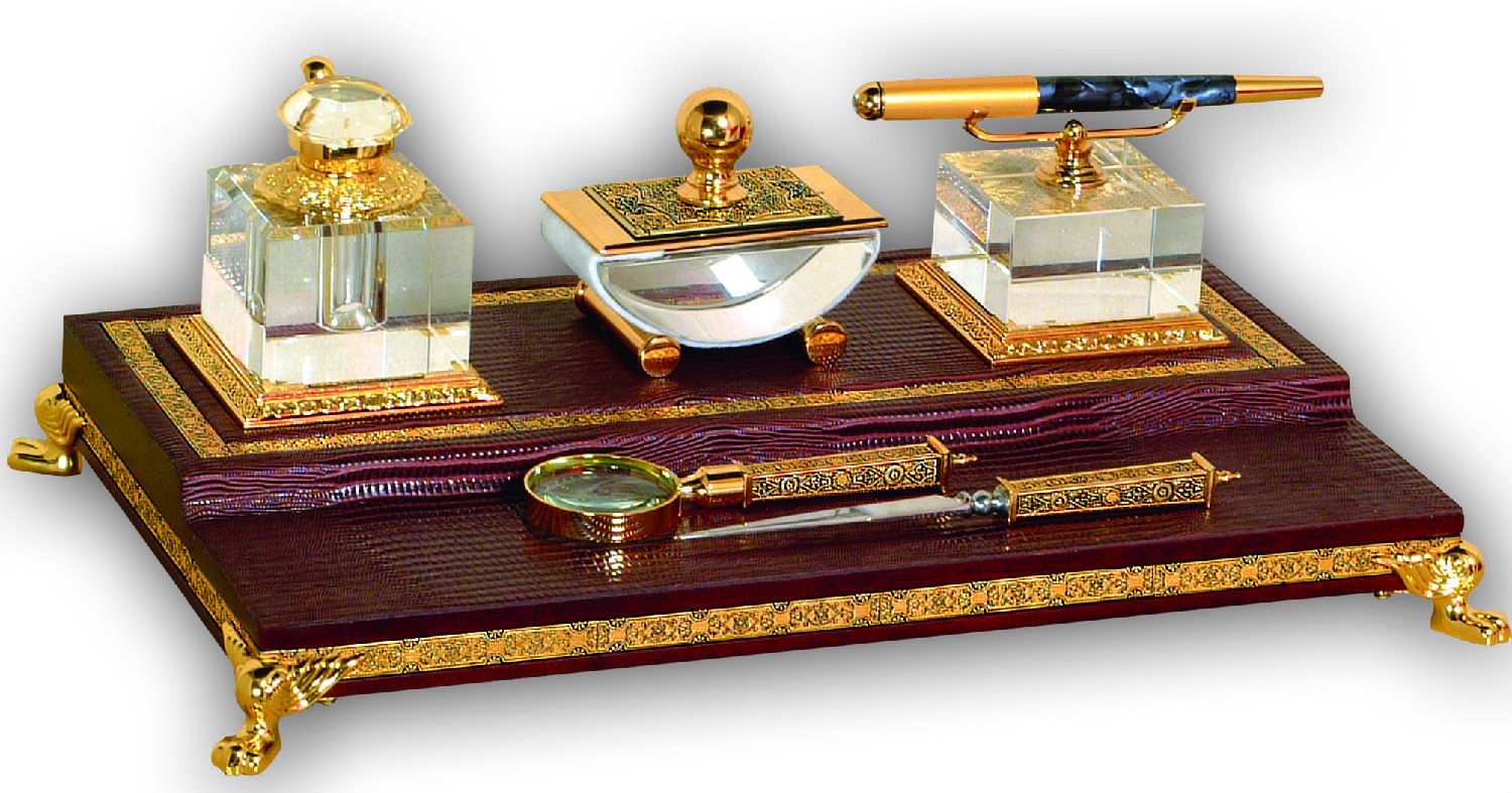- The set of three glass pieces formed by the pen holder, the ink dryer and the Ink bottle is made of high lead crystal 24% Pb.