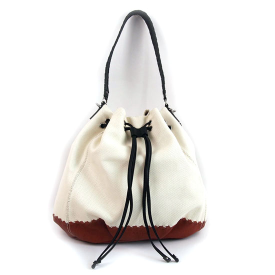 This ladies' bucket bag is a delightful choice for casual occasions in any season. The black strap and drawstring look harmonious with the white bag. The brown base gives this bag extra detail and decoration.