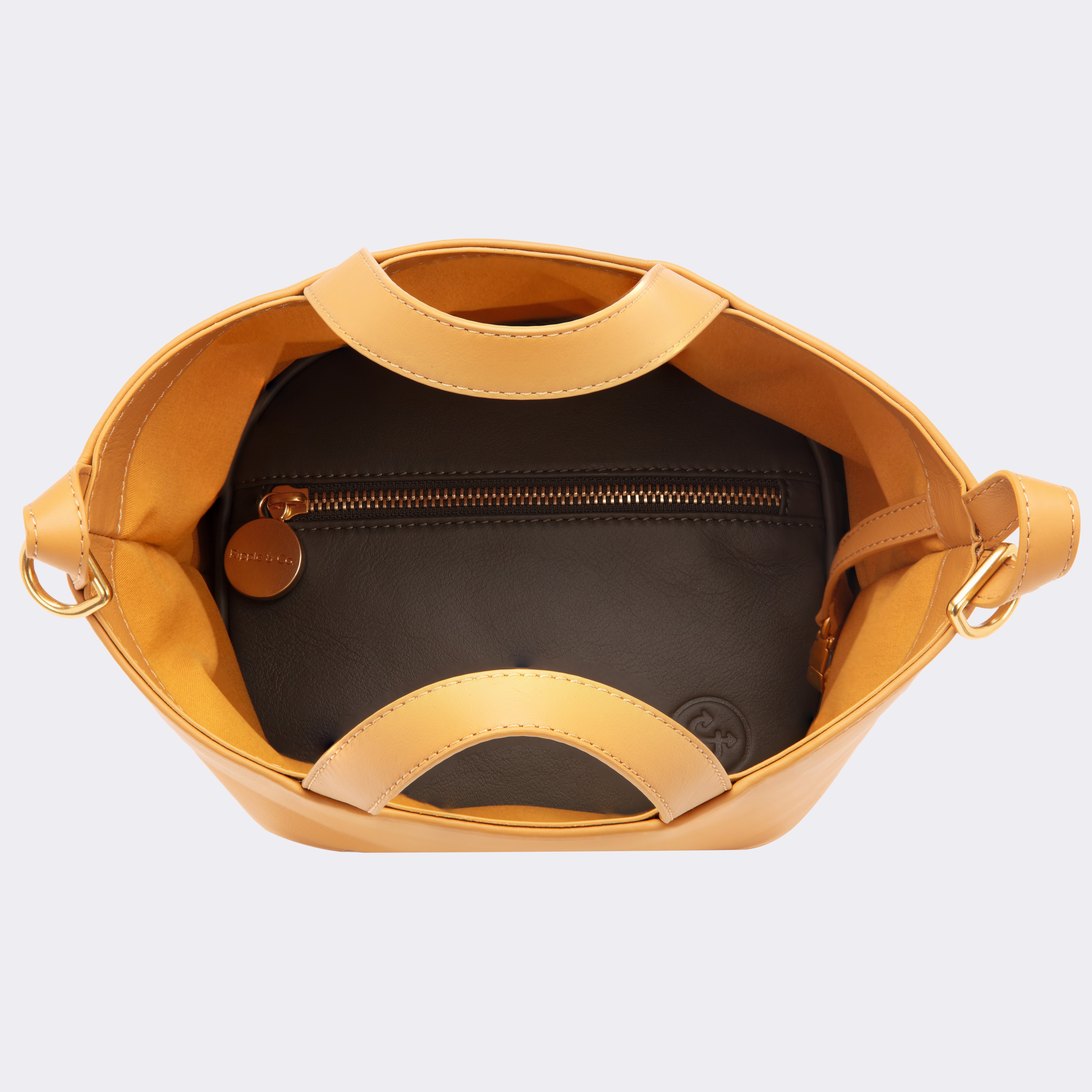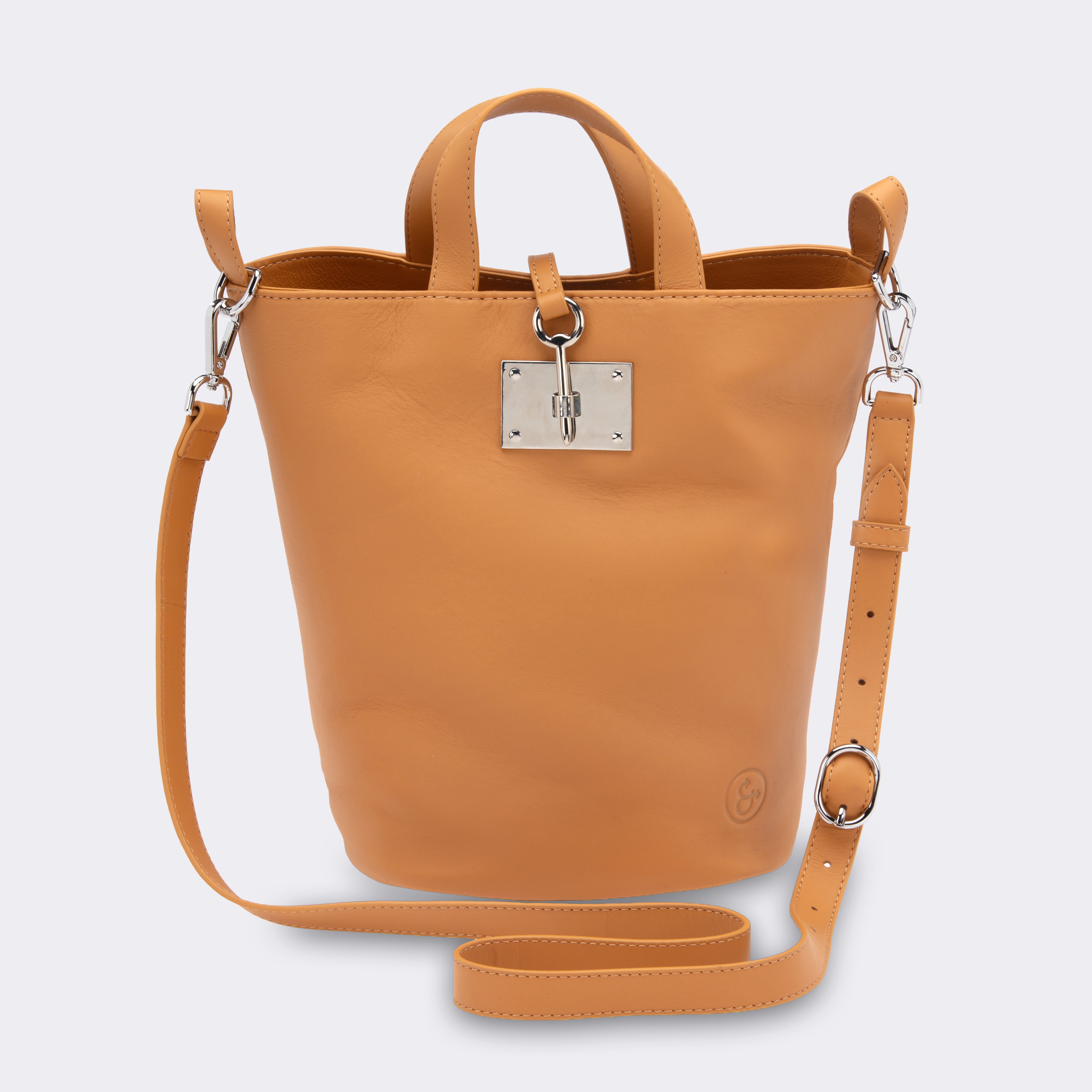 Featuring kangaroo leather with "pin" closure.(pocket inside to secure the "pin" ) Handles at comfort height. Adjustable shoulder strap. Cotton drill lining. Studs to protect leather on base. Designed to also hold the "oval bag" in the base. Colour interchangeable shoulder strap.