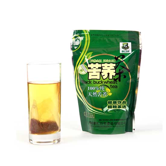 Displayed is a bag of buckwheat tea that is made from high quality buckwheat. Professionally processed, this tea retains the original fragrance and taste of buckwheat while having multiple health benefits. This convenient buckwheat tea is a great choice to maintain a healthy lifestyle.