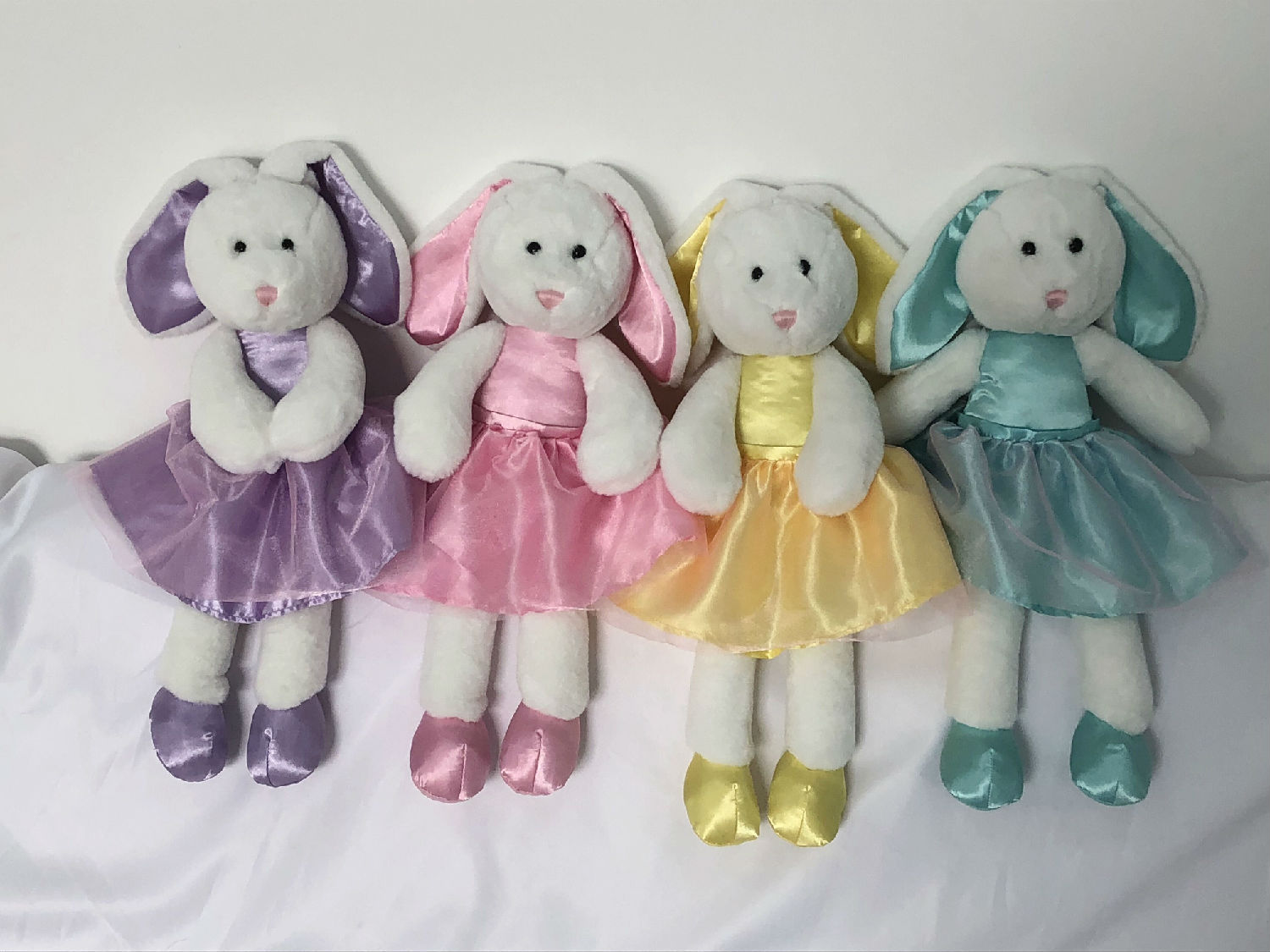 Those 4 bunnys are belong to long pile BIG Ballerina Bunny series, there are 4 colors for this series, the production size is, their fabric are very softy, and the stuffing is 100% polyester fibers.