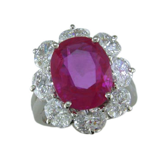 This fancy creation of a ring centers a cushion-cut Burma ruby. Surrounding it are 8 pieces of oval diamonds giving white sparkles. The band is crafted with exquisite platinum for added value and style.