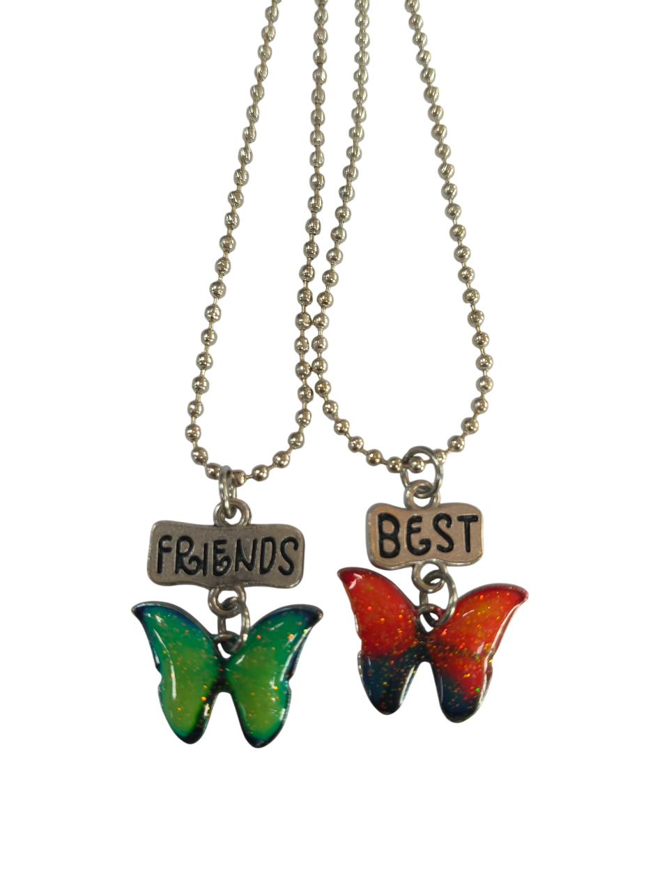 The design concept of this necklace centers around friendship and natural beauty. The words "BEST" and "FRIENDS" highlight the significance of friendship, symbolizing the special bond between friends. The butterfly - shaped pendants, with their vibrant colors and shimmering finishes, draw inspiration from the beauty of nature. Butterflies are often seen as symbols of transformation, freedom, and beauty, adding an element of elegance and positive connotations to the necklace. Overall, it combines the warmth of friendship with the allure of nature to create an appealing accessory.